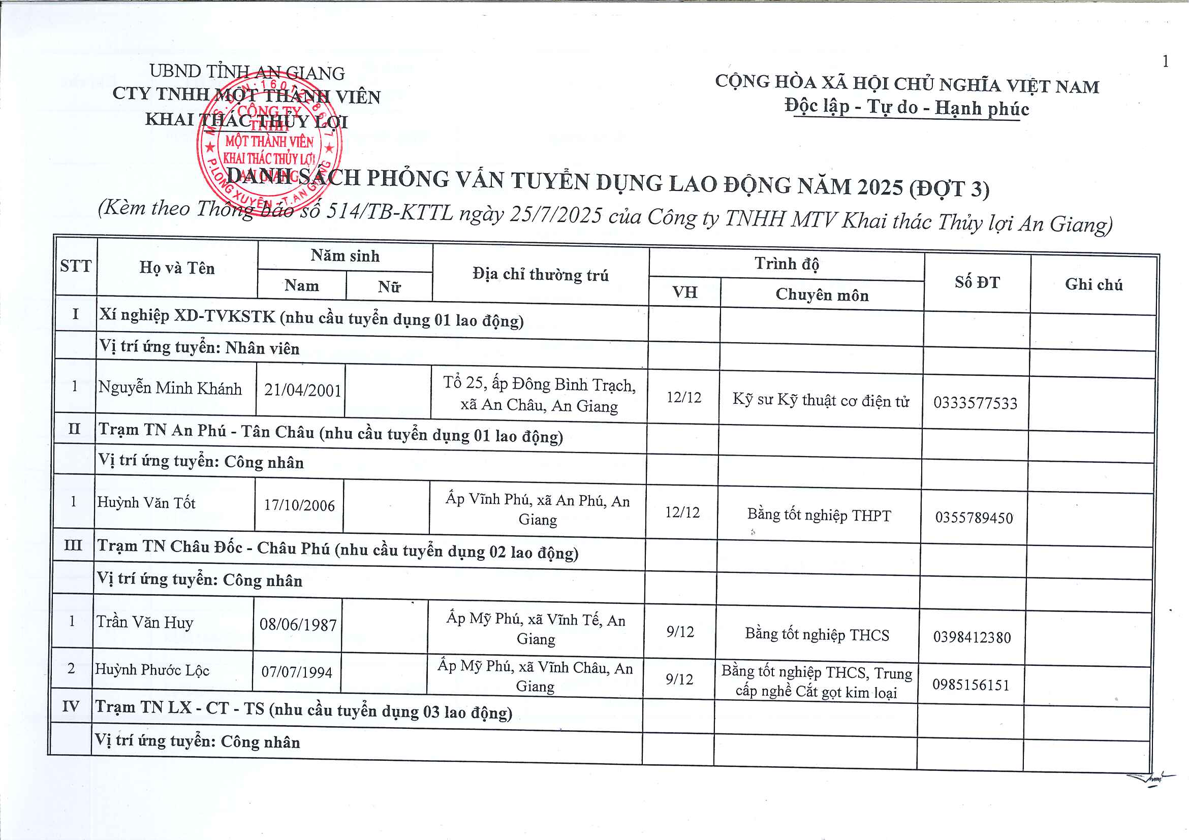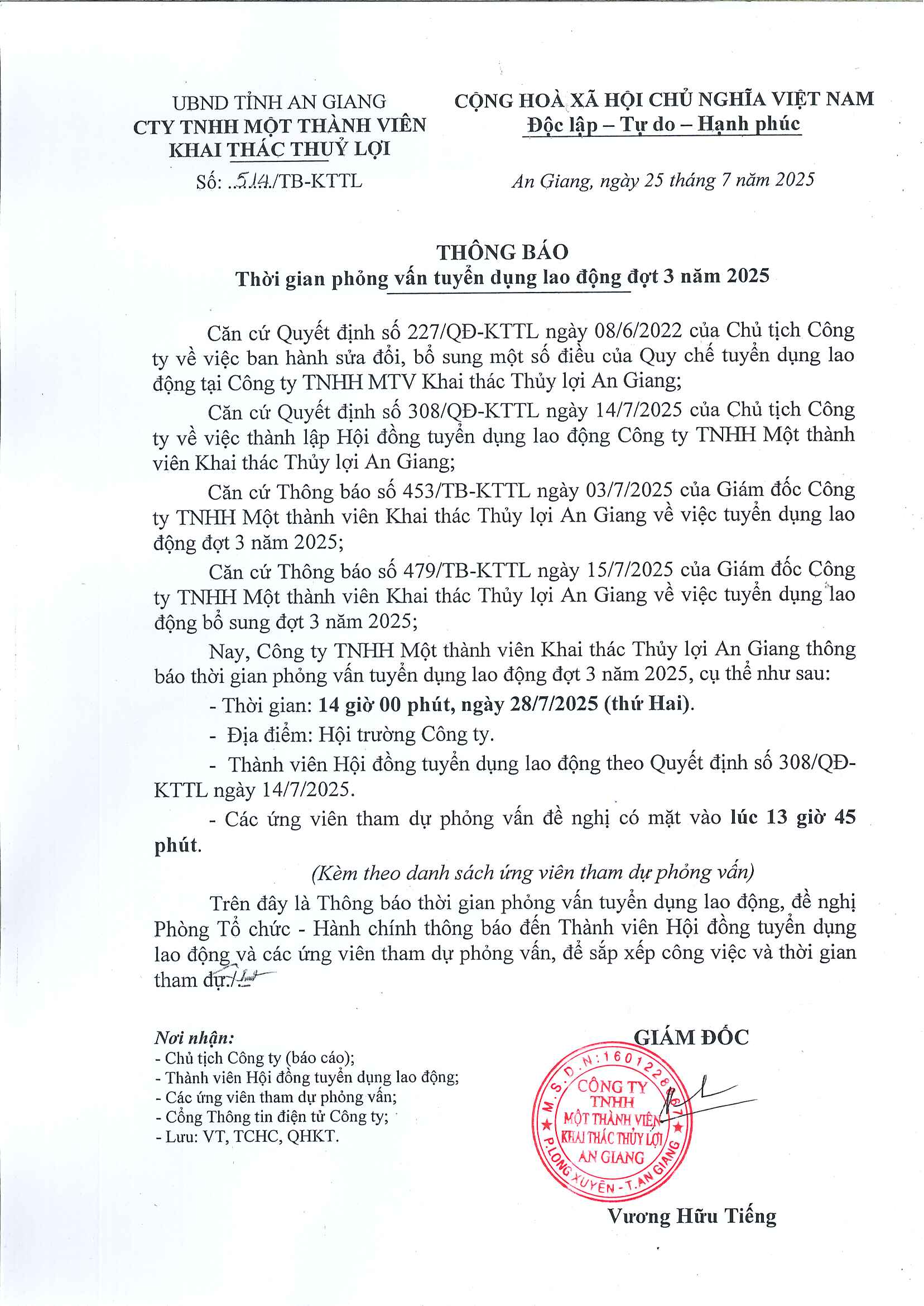 Thông báo thời gian phỏng vấn tuyển dụng lao động đợt 3 năm 2025 Được đăng: Thứ sáu, 25 Tháng 7 2025 09:19 Chuyên mục: Thông báo Lượt xem: 242